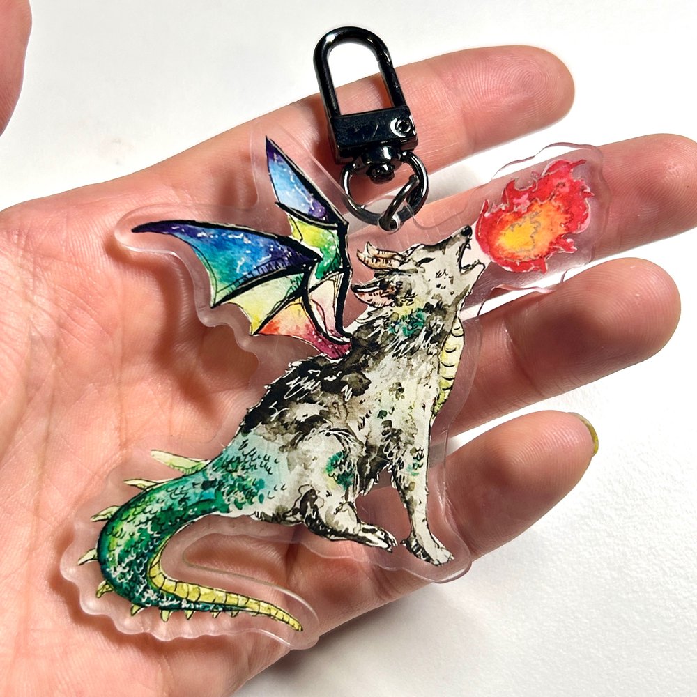 This listing is for one transparent acrylic keychain featuring my original watercolor illustration! Each keychain is double sided and approx. 3 inch in size with a dark silver u-shaped clasp.